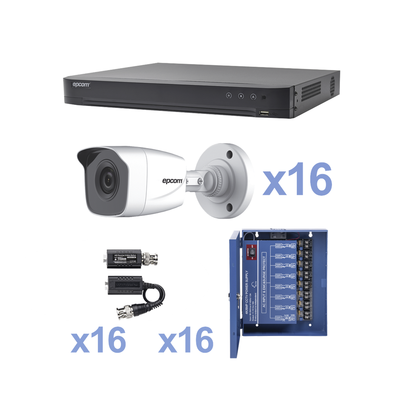 KEVTX8T16BW-EPCOM PROFESSIONAL-KIT TurboHD 1080p / DVR 16 Canales / 16 Cámaras Bala (exterior 2.8 mm) / Transceptores / Conectores / Fuente de Poder Profesional