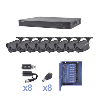 KEVTX8T8B-EPCOM-KIT TurboHD 1080p / DVR 8 Canales / 8 Cámaras Bala (exterior 2.8 mm) / Transceptores / Conectores / Fuente de Poder Profesional hasta 15 Vcc para Larga Distancia