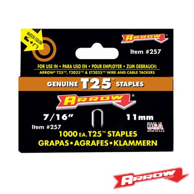 Especificaciones del artículo Marca Arrow Fastener Ancho de Corona 5/16 ‘ Se adapta al modelo T25 Longitud de Pierna 7/16 ‘ Tamaño del paquete 1000 Estilo redondo corona
