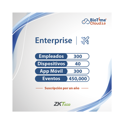 ZKT0820134-ZKTECO-LICENCIA ENTERPRISE BIOTIME CLOUD 2.0 / 300 USUARIOS / 40 DISPOSITIVOS (Licencia Anual)