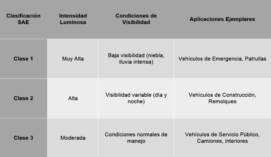 La Sociedad de Ingenieros Automotrices (SAE) establece estándares para la clasificación de los equipos de señalización en vehículos. Estas clasificaciones se basan en la intensidad luminosa y la visibilidad en diferentes condiciones. Aquí hay una descripción de cada clase y sus aplicaciones: